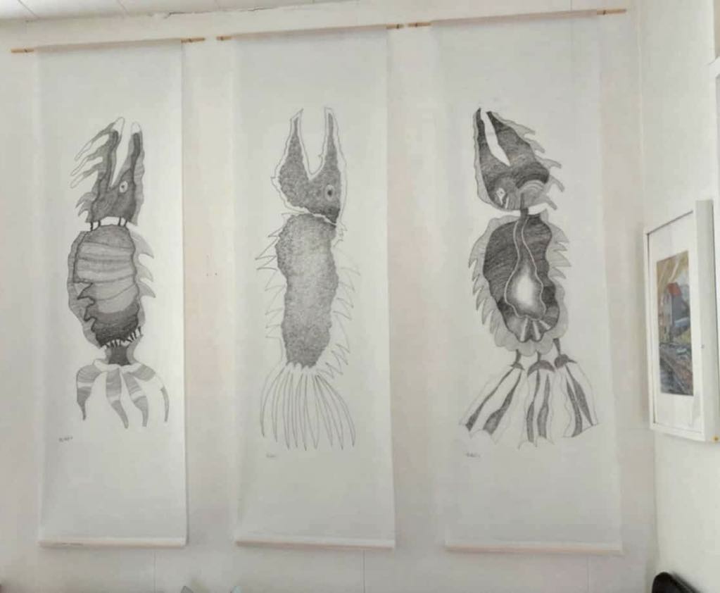 Recently I started to draw with a pencil on transparent pergamentpaper. After many years of working with the material glass, in design and artworks, I decided in the covidperiod and through illness start drawing again as beginner. I have always loved the nature, especially the Icelandic elements of gletchers, waterfalls and the sea. Now the climachange and the pollution is changing the acuaculture there.